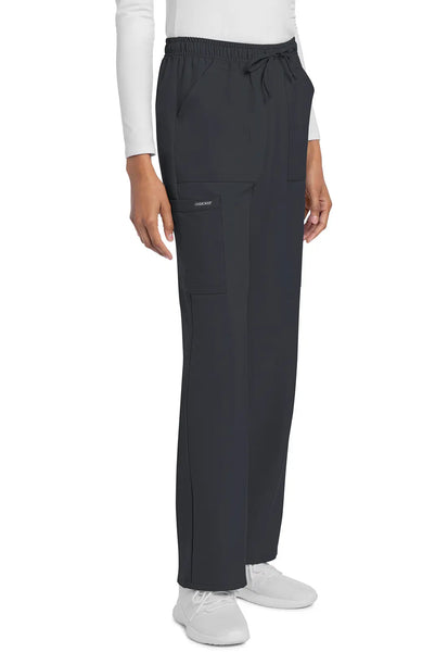 This Modern Classic fit trouser pant has a mid rise elasticized waist with drawstring. There are a total of four pockets for storage: two front patch pockets and two cargo pockets with reverse hem trim. Decorative tonal topstitching and elasticized hems finish this style. Straight leg, 18 1/2" opening. Inseam: 31"