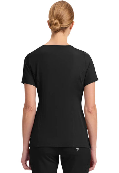This scrub top features a fashionable mock-wrap style and princess seams down the front and back.