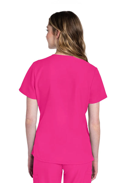 A v-neck top with built-in functionality elevates basic v-neck styling. There is a flat bungee on the neckband for an ID badge loop. There are two roomy patch pockets with a reverse hem trim. Side vents at hem for ease of movement. Decorative tonal topstitching adds the finishing touch to this scrub top. Modern Classic fit. Center back length: 26"