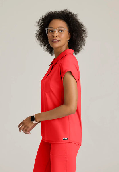 The thoughtfully designed Renew Knit Top features a single chest pocket for easy storage, a stylish collar with a snap placket, and chic dolman sleeves for added flair. The back yoke with a box pleat ensures unrestricted movement, while the wide high-low hem offers a trendy silhouette. Crafted with antimicrobial finish to combat mold and mildew, this durable top also boasts soil-release fabric and moisture-wicking Spandex stretch for all-day comfort.