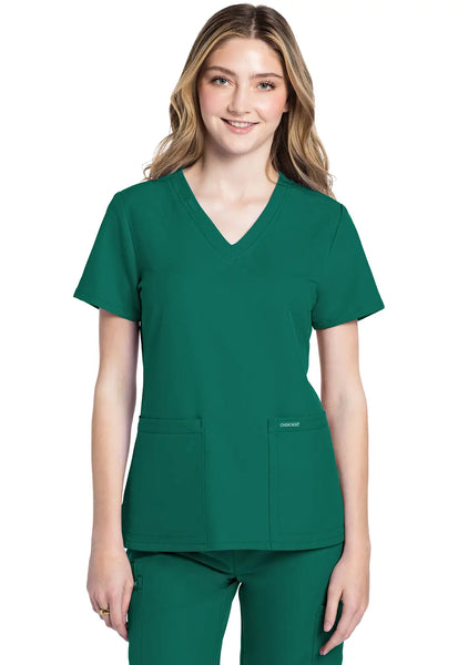A v-neck top with built-in functionality elevates basic v-neck styling. There is a flat bungee on the neckband for an ID badge loop. There are two roomy patch pockets with a reverse hem trim. Side vents at hem for ease of movement. Decorative tonal topstitching adds the finishing touch to this scrub top. Modern Classic fit. Center back length: 26"