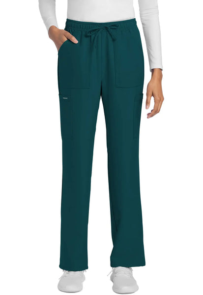 This Modern Classic fit trouser pant has a mid rise elasticized waist with drawstring. There are a total of four pockets for storage: two front patch pockets and two cargo pockets with reverse hem trim. Decorative tonal topstitching and elasticized hems finish this style. Straight leg, 18 1/2" opening. Inseam: 31"