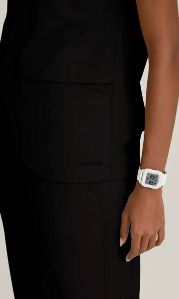 Stay comfortable and professional with this classic scrub top featuring three pockets—a chest pocket and two waist patch pockets. Designed with a V-neck and shirt collar, cuffed dolman sleeves, and a center back pleat for easy movement. An adjustable high-low hem with internal bungee and a badge loop on the shoulder add function and style.