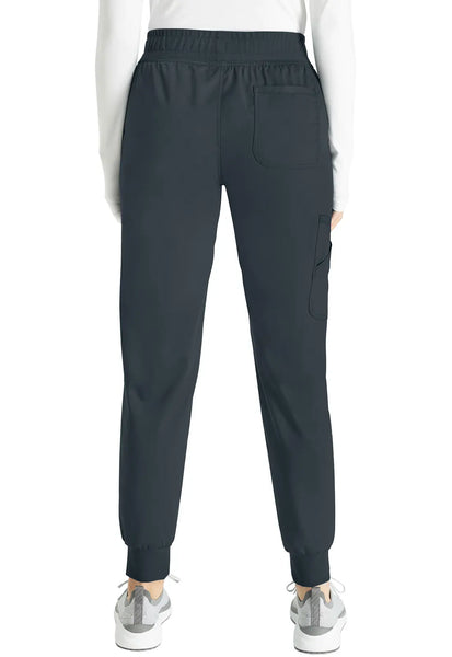 This Modern Classic fit mid rise pull-on jogger has an encased elastic knit waistband with interior drawstring. There are five pockets: two front patch pockets, a double cargo pocket with a bungee ID badge loop, and one back patch pocket. The pant also features a tapered leg and knit cuffs. Leg opening: 9 1/2". Inseam: 28 1/2"
