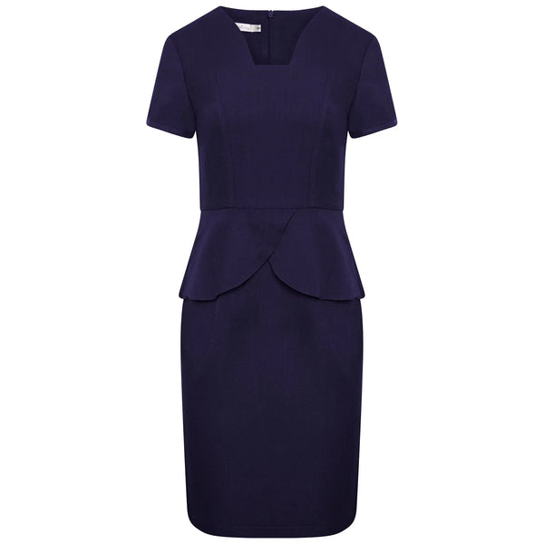 This elegant, flattering work dress features an angled neckline, nipped in waist, peplum detail and is available in a range of colour options.