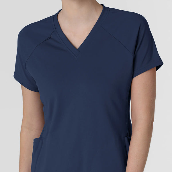 Knit raglan sleeves and comfortable details make this women's scrub top a perfect match for your busy shifts. It's built from soft and stretchy fabric that makes movement easy. Because lifting and leaning are part of the job, our Flex-n-Reach panels provide extra stretch where you need it most. A curved droptail hem gives you a flattering fit plus coverage that lets you travel confidently through your day. It pairs perfectly with slim-fit scrub pants, delivering a modern look that's polished and professional. Two front zip pockets and one side top-loading pocket hold all the tools and essentials you need for a successful day balancing your to-do list and unexpected tasks. Keep your badge at the ready thanks to a loop on one shoulder, then when you don't need it, it stays out of your way. This scrub top has a modern fit that skims your body without feeling too tight or too loose. It's part of our RENEW collection of eco-friendly scrubs.